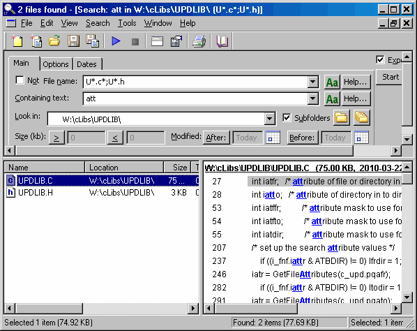 I can start it the same ways I did the Windows Search, type a few keys and I'm looking at the list of files. After a few more keys to search contents, I can pick a file and it shows me the lines inside that match my search string.